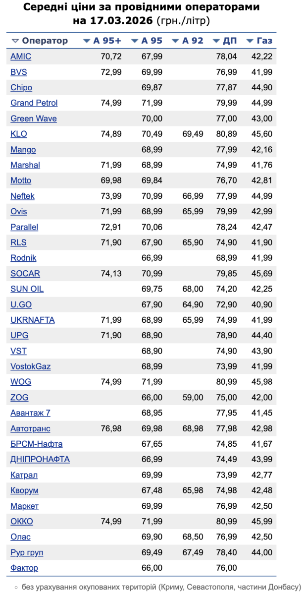 По состоянию на 17 марта, темпы роста цен на украинских заправках значительно ускорились. По сравнению с данными за 13 марта стоимость всех видов топлива заметно выросла, а дизельное топливо продемонстрировало наибольший скачок, приблизившись к психологической отметке в 80 грн. Об этом сообщает «Минфин» со ссылкой на данные Консалтинговой группы «А-95».