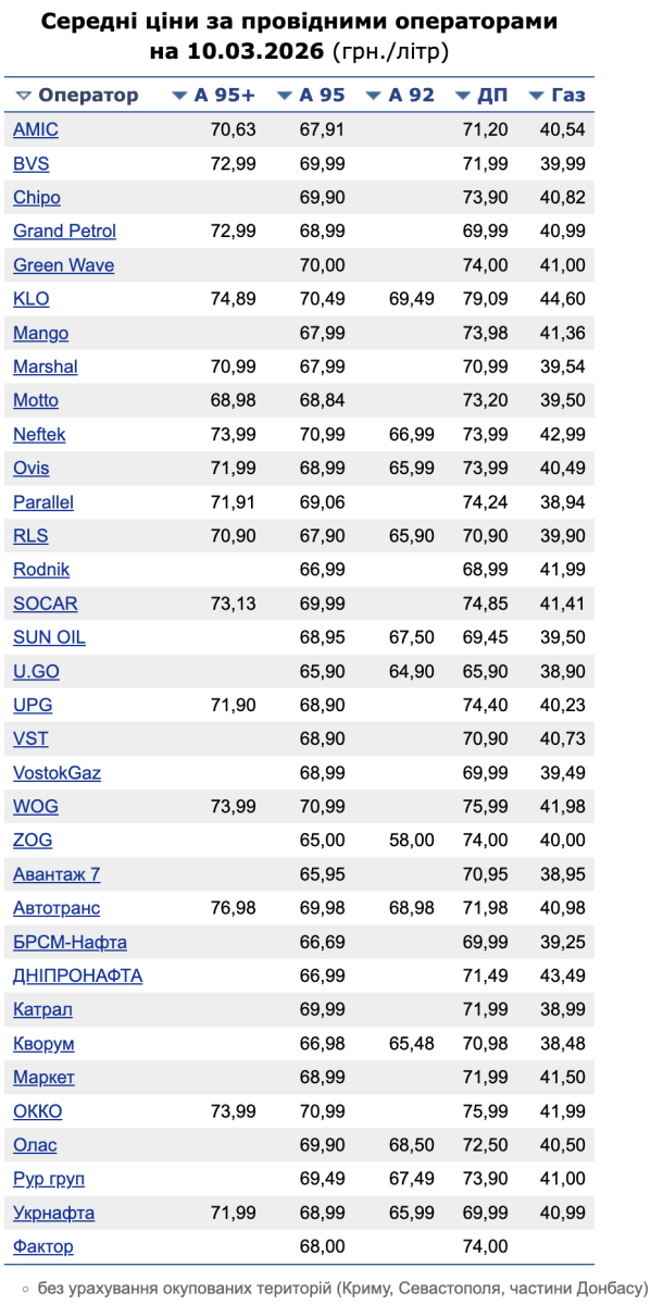 Средние цены на горючее по состоянию на 10 марта