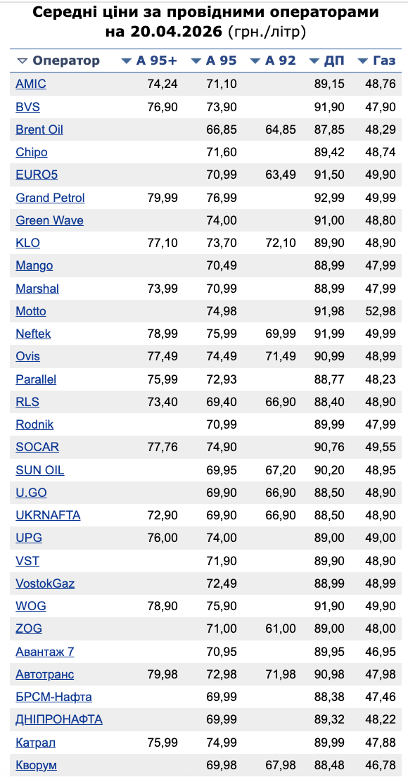 В частности, зафиксированы следующие средние цены на топливо: бензин марки А-95 (премиум) — 76,50 грн/л (подешевел на 9 коп.); бензин марки А-95 — 72,71 грн/л (подешевел на 30 коп.); бензин марки А-92 — 67,32 грн/л (подешевел на 2 коп.); дизтопливо — 89,92 грн/л (подешевело на 1 грн 33 коп.).