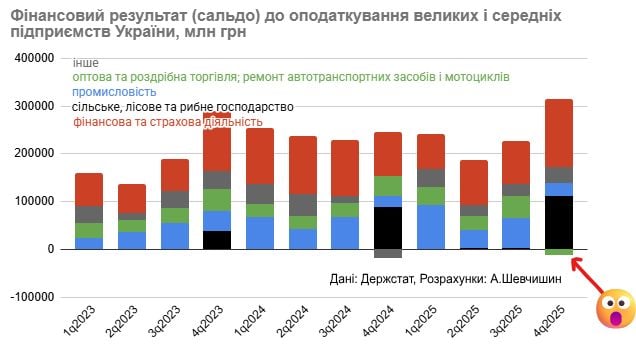Итоги четвертого квартала 2025 года выявили нетипичную для украинского рынка ситуацию: сектор оптовой и розничной торговли впервые за длительное время зафиксировал чистые убытки, тогда как финансовый сектор достиг пиковых показателей доходности. Об этом сообщил финансовый аналитик Андрей Шевчишин на своей странице в Facebook.