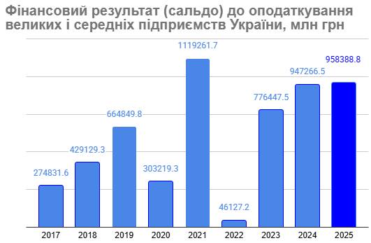 Финансовый результат крупных и средних предприятий до налогообложения в 2025 г. вырос всего на 1,2% до 958,4 млрд грн.