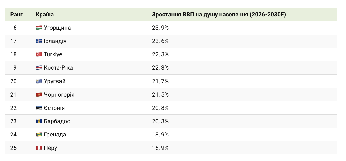 Многие страны с самым быстрорастущим ВВП на душу населения являются странами с развивающейся экономикой. Молдова лидирует в рейтинге с прогнозируемым ростом на 53% между 2026 и 2030 годами.