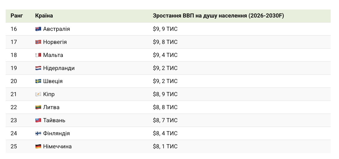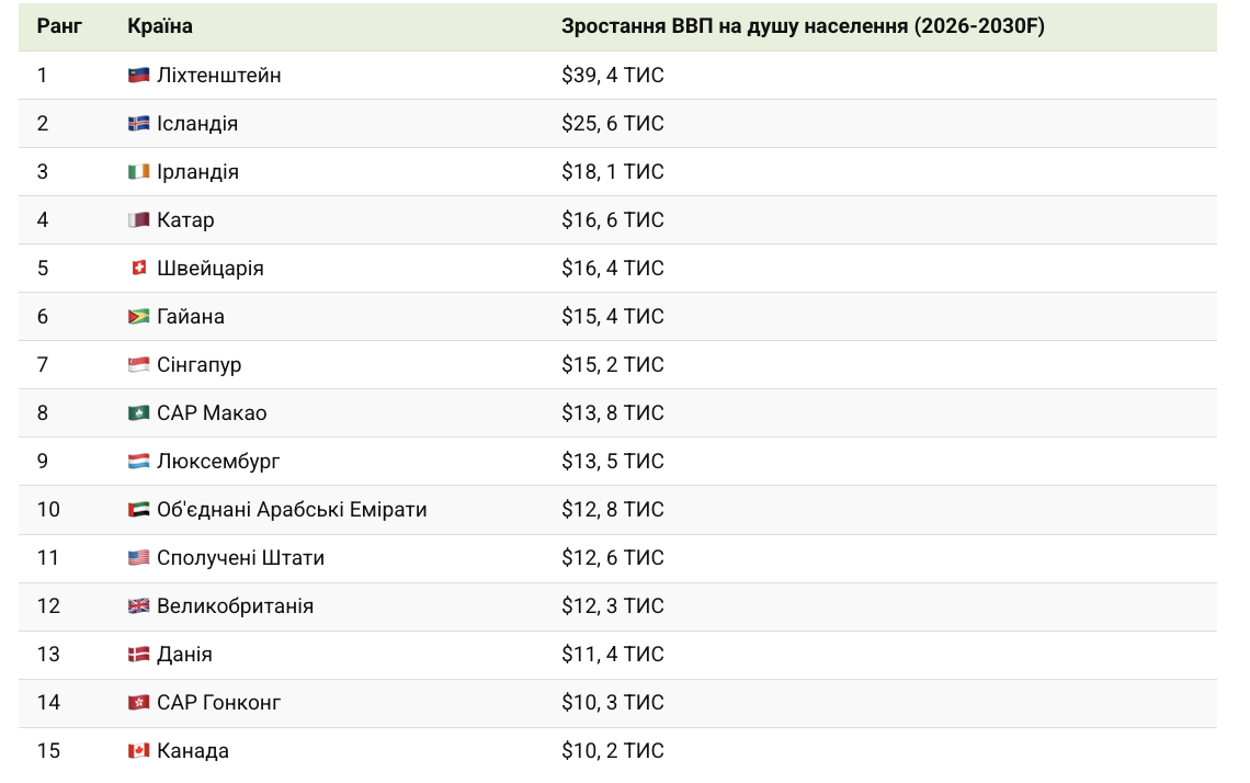 Прогнозируется, что такие страны как Лихтенштейн, Исландия, Ирландия и Катар прибавят десятки тысяч долларов к ВВП на душу населения между 2026 и 2030 годами.