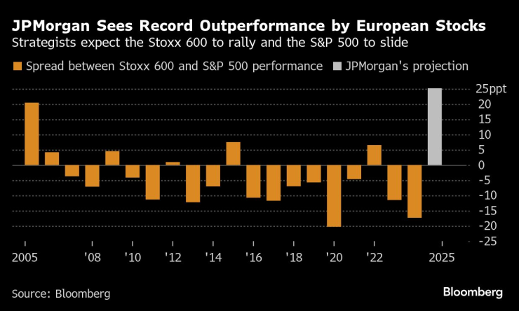 Разница между европейскими и американскими целями JPMorgan показывает, что STOXX 600 превзойдет индекс S & P 500 с 25 процентными пунктами в 2025 году, что является самым высоким в истории, в то время как прогнозы Citi будут лучшими с 2005 года.