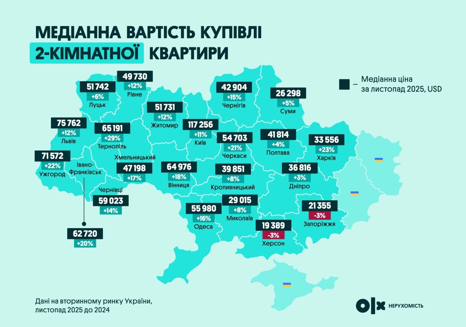 Цена в Луцке осталась на прошлогоднем уровне, тогда как снижение произошло только в Запорожье (-3%) и Николаеве (-2%). Самая высокая медианная цена покупки 1-комнатной квартиры в Киеве, которая в 2025 году выросла на +16%.