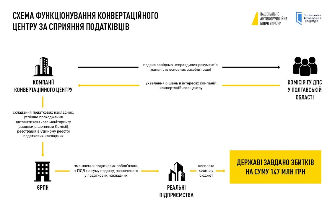 Следствие установило, что тогдашний исполняющий обязанности главы Государственной налоговой службы Украины способствовал бесперебойной работе конверсионного центра, а заместитель начальника Главного управления Государственной налоговой службы в Полтавской области, который возглавлял комиссию по вопросу прекращения регистрации налоговых накладных, обеспечивал принятие решений в пользу предприятий конверсионного центра.