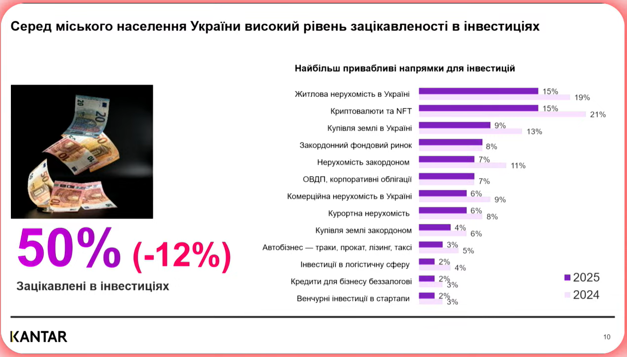 Данные «Кантар Украина» об инвестициях по направлениям среди тех, кто уже имеет инвестиции, показывают заметное падение доверия к криптовалютам и рост интереса к традиционным и государственным инструментам в 2025 году.