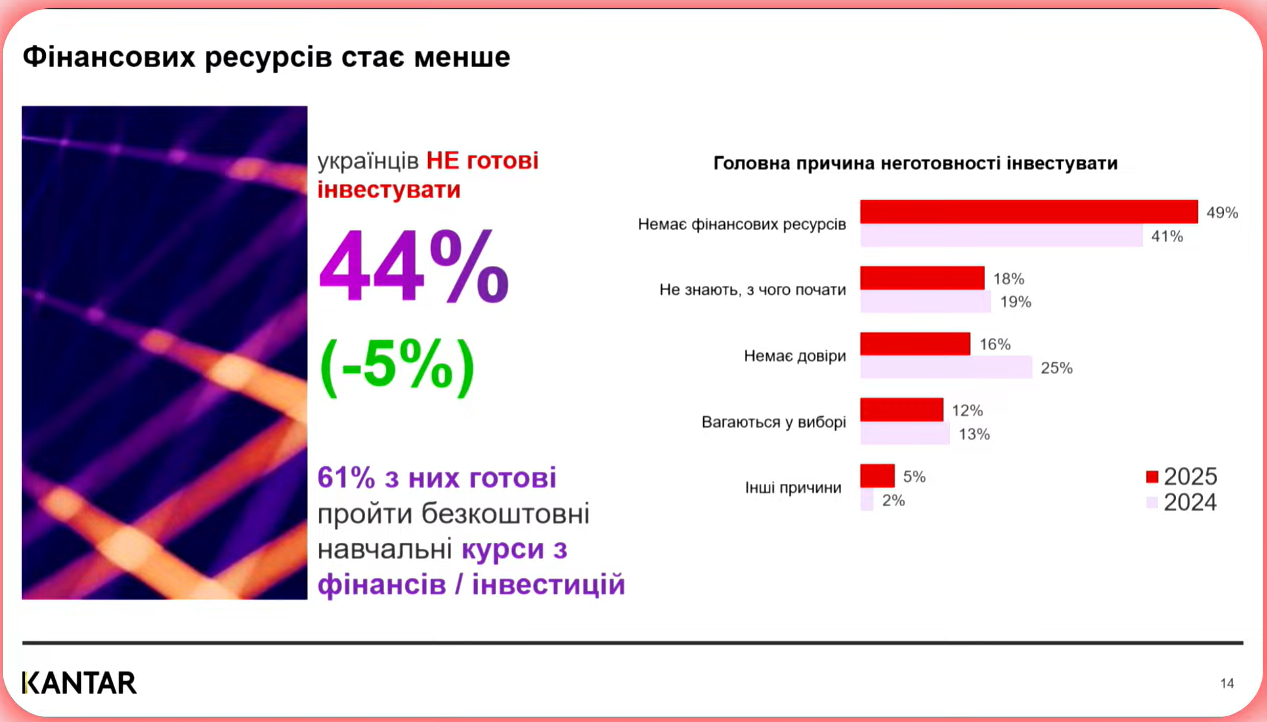 Общая ситуация и настроения инвесторов в Украине ухудшились по сравнению с прошлым годом. Об этом заявил директор по развитию бизнеса исследовательской компании «Кантар Украина» Кирилл Ежов, представляя результаты исследования инвестиционных настроений украинцев в 2025 году на конференции «Жизнь на проценты».
