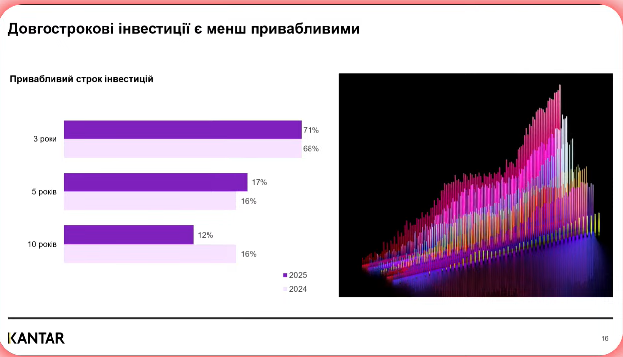 Долгосрочные инвестиции становятся менее привлекательными для украинцев в 2025 году по сравнению с 2024 годом. Наибольшее снижение интереса зафиксировано для инвестиций с 10-летним горизонтом, где доля заинтересованных инвесторов снизилась с 16% в 2024 году до 12% в 2025 году.