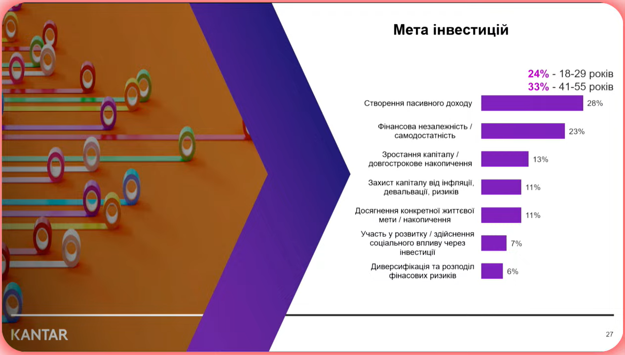 Основной целью инвестирования остается создание пассивного дохода, особенно среди старшей возрастной группы. Финансовая независимость является более сильной мотивацией для молодых людей (18-29 лет).