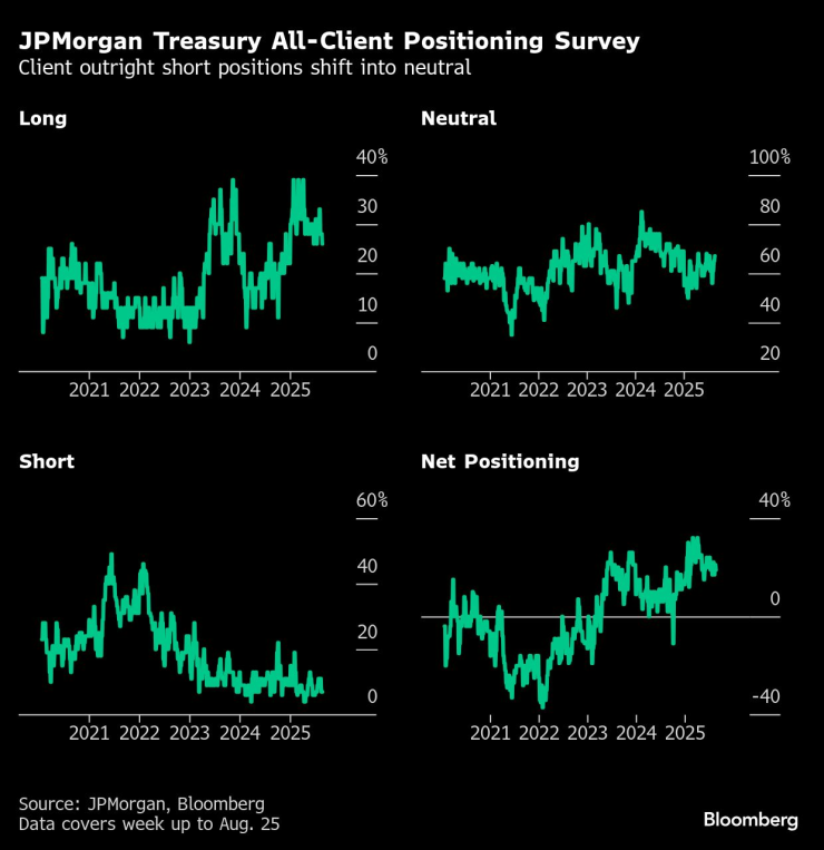 В течение недели, закончившейся 25 августа, опрос клиентов JPMorgan показал, что длинные позиции упали на 2 процентных пункта, перейдя в нейтральный. Короткие позиции остаются без изменений.
