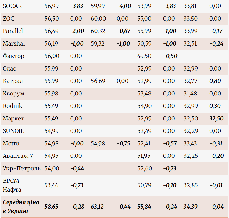 Через неделю с 18 августа по 25 августа произошло небольшое снижение цен на все виды топлива в Украине. Средняя стоимость бензина A-95 снизилась на 28 центов (до 58,65 уах/л), A-95+-By 44 копейки (до 63,12 уах/л). Цены на дизельное топливо упали на 24 копейки (до 55,84 уах/л), а на автобусе — на 3 копейки (до 34,39 уах/л).