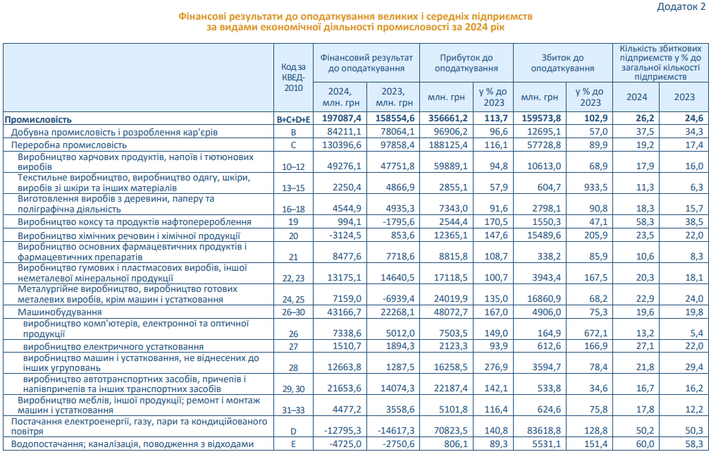 В 2024 году финансовый результат до налогообложения крупных и средних предприятий составил 947,3 млрд. США (в 2023 году — UAH 776,4 млрд). Прибыль достигли 1 220,6 млрд. Или 119,0% по сравнению с 2023 годом, убытки были разрешены в сумме 273,3 млрд. Соглашений (или 109,7%). Об этом свидетельствует Служба статистики государства.