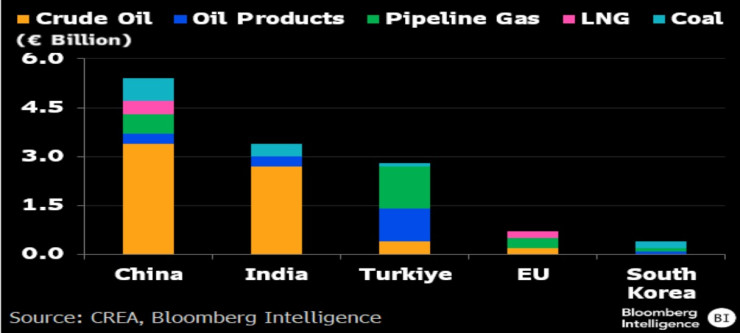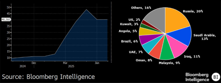 Президент США Дональд Трамп занял более жесткую позицию в отношении России и ее экспорта энергоносителей, поскольку Украина продолжает атаковать с помощью дронов российские нефтеперерабатывающие заводы. Однако в сентябре экспорт российской нефти вырос примерно на 170 000 баррелей в сутки: Китай импортировал российскую нефть на сумму около 3,3 миллиарда евро (около 70 миллионов баррелей за месяц), а Индия купила на сумму около 2,7 миллиарда евро, или около 60 миллионов баррелей.