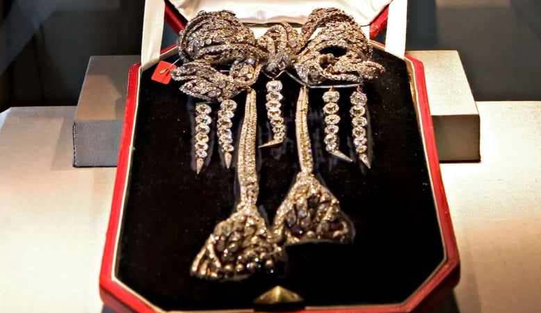 - Бриллиантовый бант императрицы Евгении: приобретен Лувром в 2008 году за 6,72 миллиона евро (7,8 миллиона долларов) в рамках частной сделки, лот был раскуплен перед аукционом Christie’s. 121 годом ранее, в 1887 году, он был продан на аукционе всего за 42 200 французских франков (около 85 000 евро на тот момент).