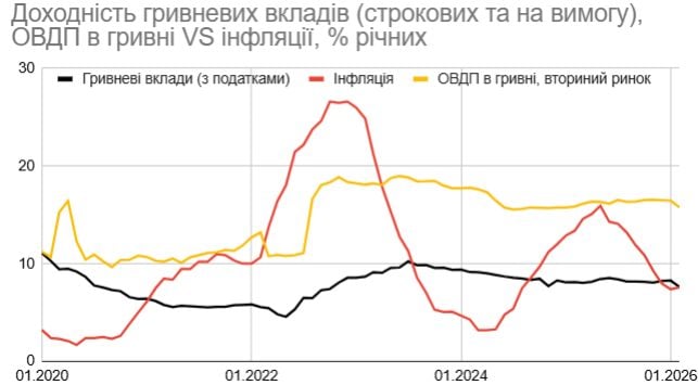 После налогообложения процентного дохода для большинства вкладчиков по ставке 18% НДФЛ + 5% военного сбора, чистая доходность гривневого депозита опускается примерно до 7,6% годовых, то есть вплоть до годовой инфляции в 7,6%, зафиксированной в феврале. По срочным депозитам чистая доходность составляет 10,3%. Иными словами, депозит в гривне сейчас скорее сохраняет покупательную способность, чем дает выраженную реальную прибыль.