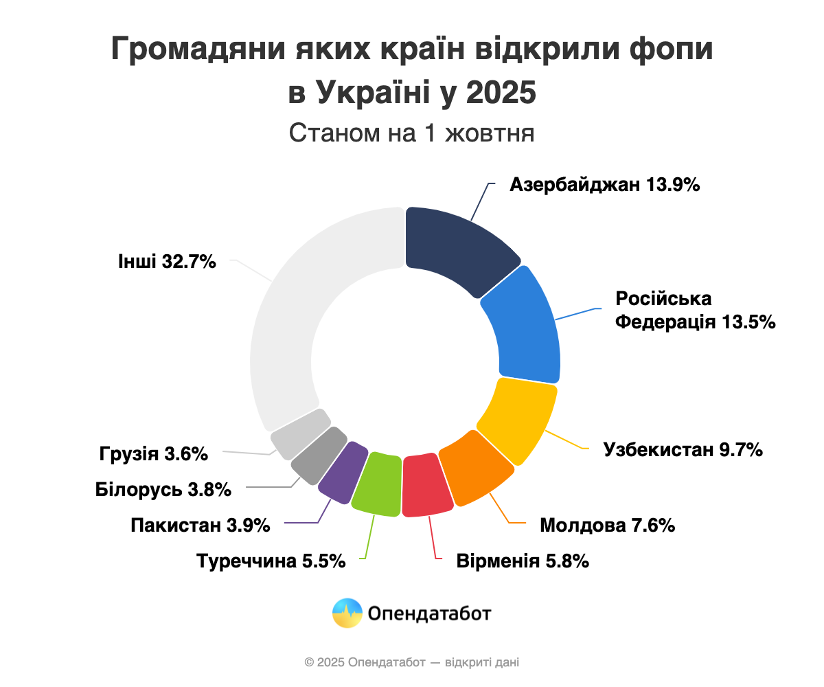 Больше всего новых предпринимателей выходцы из Азербайджана — 229 ФОПов (14%), подражавших граждан РФ — 222 (14%), Узбекистана — 160 (10%), Молдавии — 125 (8%) и Армении — 95 (6%).