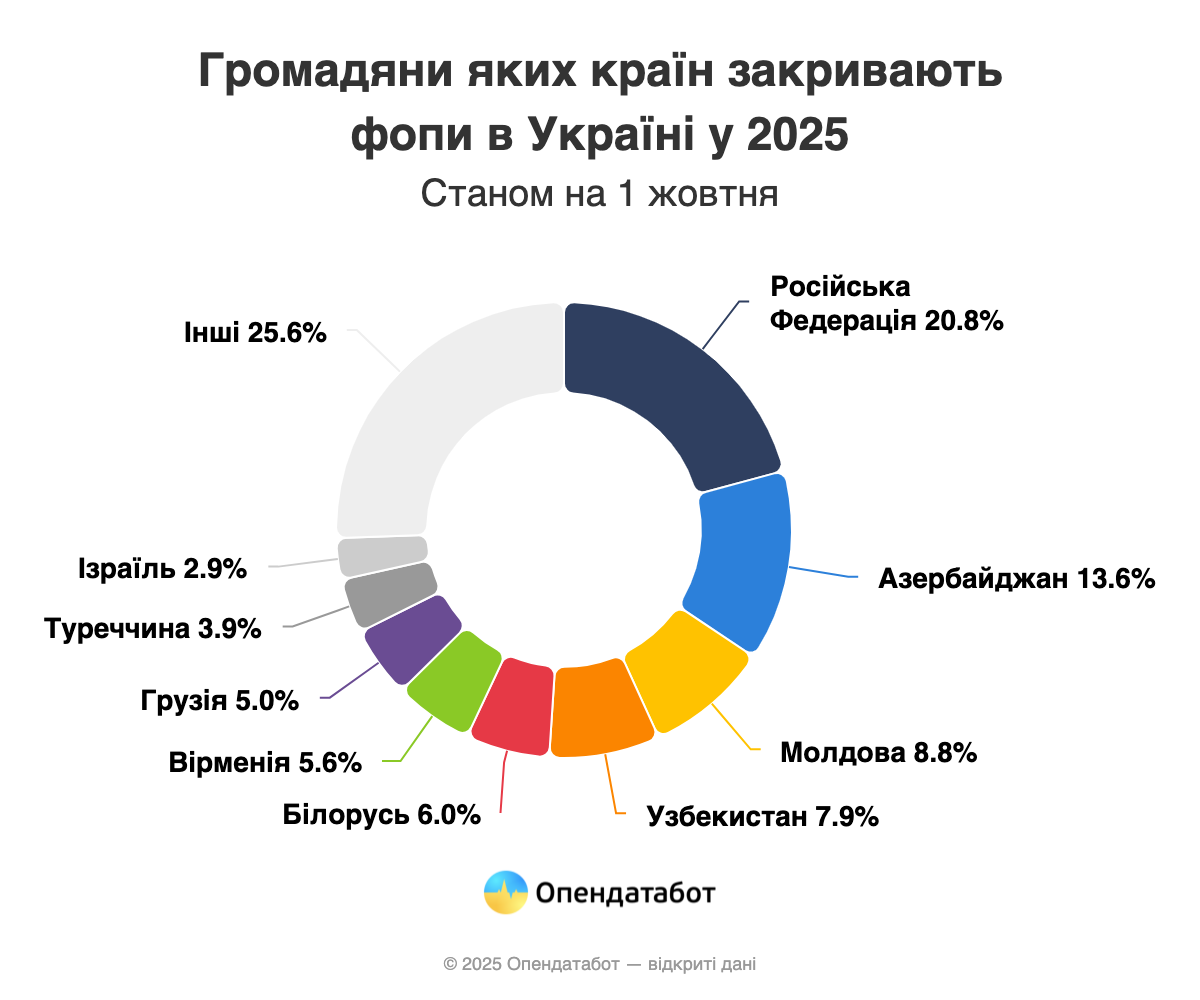 Зато чаще других бизнес останавливают граждане России — 241 ФОП (21%), Азербайджана — 157 (14%), Молдовы — 102 (9%), Узбекистана — 91 (8%) и Белоруссии — 69 (6%).