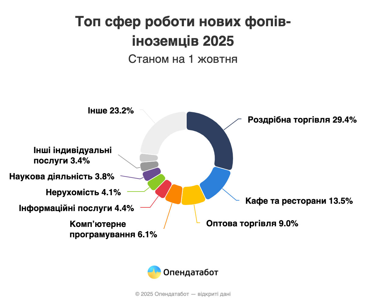Подавляющее большинство иностранцев выбирают бизнес в сфере торговли – почти каждый третий бизнес. Кстати, эта сфера востребована среди ФОПов украинцев. Далее следуют общепит (14%), оптовая торговля (9%), компьютерное программирование (6%) и информационные услуги (4%).