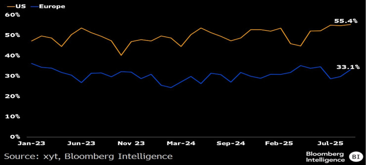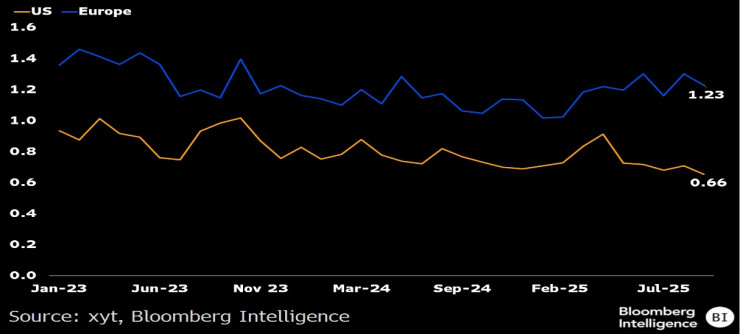 Настроения на рынке опционов в США и Европе продолжают сильно различаться. В сентябре соотношение пут-колл в США упало до 0,66, сигнализируя о сильном бычьем уклоне, поскольку трейдеры предпочитали опционы колл защитным опционам пут.