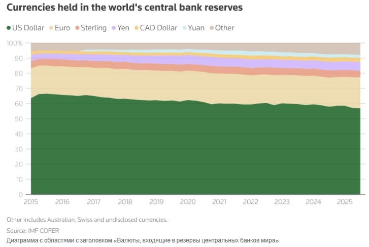 В третьем квартале 2025 года доля доллара США в мировых валютных резервах, по данным Международного валютного фонда, незначительно снизилась до 56,92%, а доля евро, наоборот, несколько увеличилась.