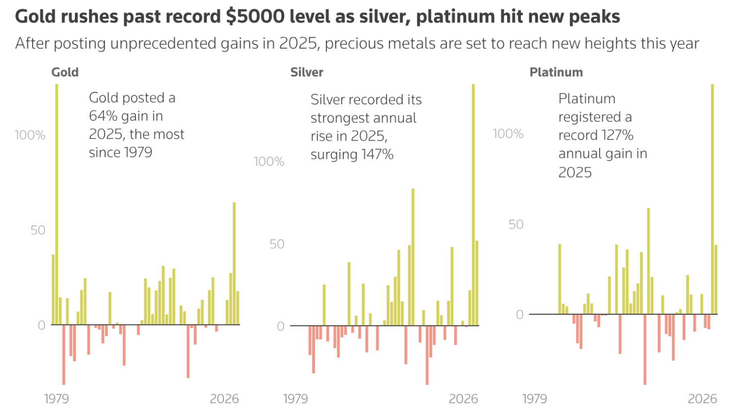 Цена на золото выросла до рекордного уровня более $5000 за унцию в понедельник, 26 января, продолжив исторический рост, поскольку инвесторы вкладывались в актив-убежище на фоне растущей геополитической неопределенности.